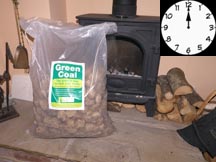 It needs to be dry as it absorbs moisture. Keep it in its bags in a rainproof area or preferably inside a hut or garage. Its bulk density is 500kg per cu. meter so it doesn’t take up a large amount space. Use it a bit like logs or barbecue charcoal. We have tested it on ordinary wood stoves and it lights easily and burns cleanly. You control the rate of burning like logs. It burnt a little faster than wood but seemed to give out plenty of heat. The following morning there was a large pile of ash. The stove reached a surface temperature of 2100C.